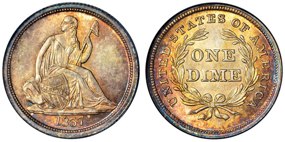 In a year in which we were pleased to offer the finest known 1796 Myddelton Token in Silver and many other condition census colonial coins (many pedigreed to the Norweb, Garrett, Eliasberg and other notable collections), beautifully toned U.S. type, way more than our fair share of gold stickered gold coins, and myriad magnificent world coins, we’re going to have to go with this exquisite, über-gem, gold-stickered 1837 No Stars Dime: