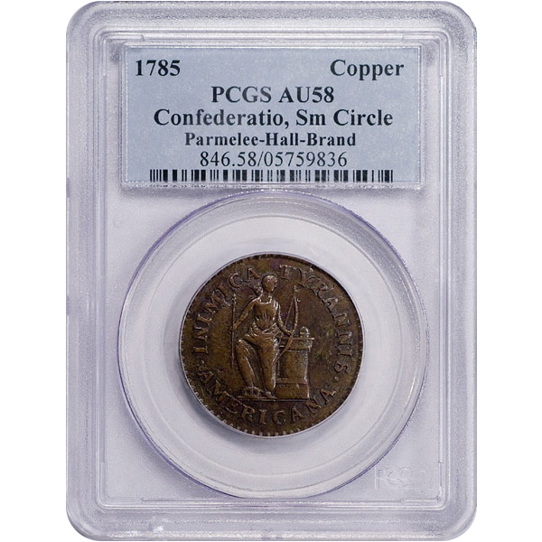 Based on a design put forth by Thomas Jefferson, this issue bears the distinctive image of Diana the Hunter (symbolic of freedom) trampling the English crown, surrounded by the legend INIMICA TYRANNIS AMERICANA (America Opposed to Tyranny). The reverse mimics a sketch done by Jefferson depicting stars representing the original colonies with the legend CONFEDERATiO (Union) above and the 1785 date below.