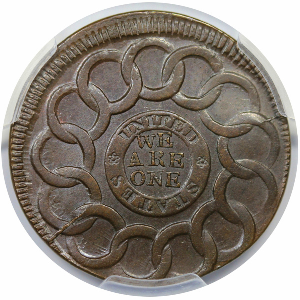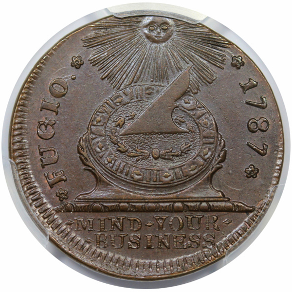 This issue is sometimes seen slightly off center, as here, quite similar in fact to the example plated in Sylvester Crosby’s 1875 The Early Coins of America, though that one seems to be a different specimen.