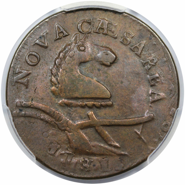 A cool and crusty golden brown AU example overstruck on a 1787 Connecticut Copper with the details of the host coin boldly visible on the obverse and reverse.