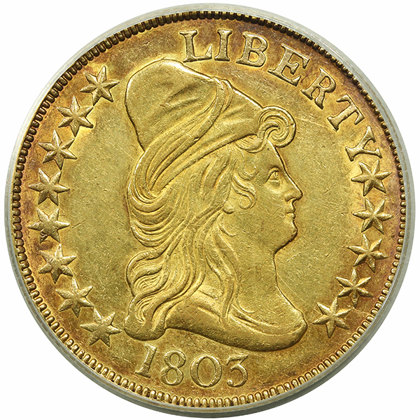 With superb golden orange color, lovely deeper golden orange toning, luster in the devices and looking much, much better than AU50 to this author. And CAC concurred, giving this coin a gold sticker – which is a rare occurrence in this series, as there are a grand total of just two (2) gold stickered early $10s in any grade and year from 1795-1804, the other being a 1799 in XF45.