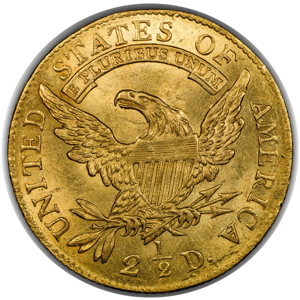 The 1808 and 1796 No Stars quarter eagles are virtually tied for the status of “rarest U.S. gold type coin.” Bass-Dannreuther place both at R.4, estimating 125-150 pieces known of the former and 104-131 of the latter. However, the 1808 is also more conditionally elusive grade for grade than the 1796 No Stars, of which there are numerous high-grade survivors. In MS62 or finer, we have only traced twelve 1808 quarter eagles, and in MS63 or finer, the population dwindles to half that. The finest is a single MS65, formerly in the collections of J. Hewitt Judd and Congressman Jimmy Hayes. After that are five MS63 examples, including the present example, tying it for second finest known. Certification data supports this assertion: PCGS lists one in 65 (the Judd-Hayes coin) and one in 63, and NGC lists five certifications in 63 atop its census (11/25). This lot presents the type collector with a rare opportunity to acquire this one-year emission in high Condition Census quality.