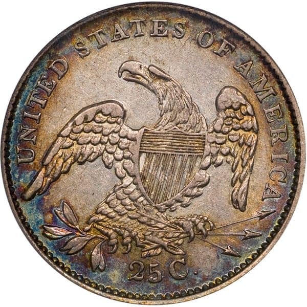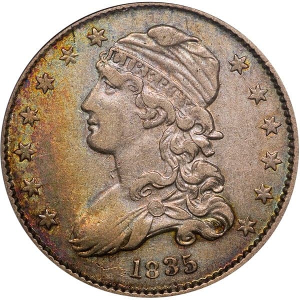 A nice coin gray piece with some pretty toning in shades of golden, russet and deep blue, and a good value at today’s levels in our admittedly biased view.