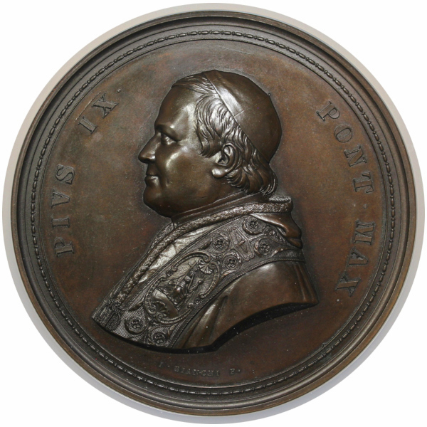 With a stunning, super deep (the deepest of any architectural medal we’ve handled) 3-D interior image of the Basilica on one side, and a portrait of Pope Pius IX on the other.