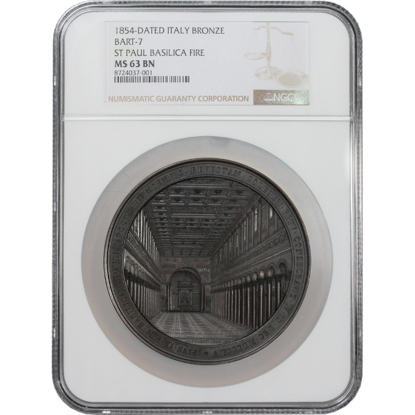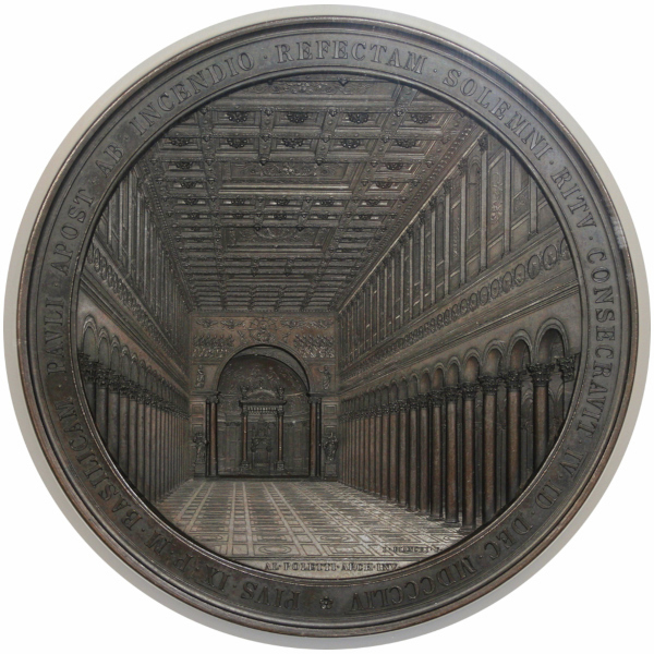This medal was issued to commemorate the reconsecration of St. Paul’s Basilica Outside the Walls (of the Vatican) in 1854 after it was all but destroyed by fire in 1823 and then rebuilt.