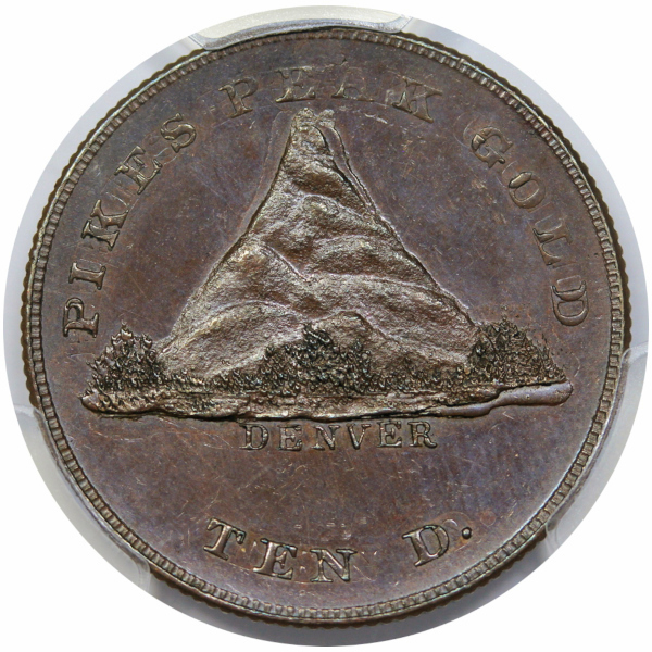 One of the great designs in the American series with a whimsical depiction of Pikes Peak as rendered by an engraver who never actually saw it.