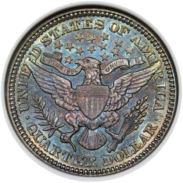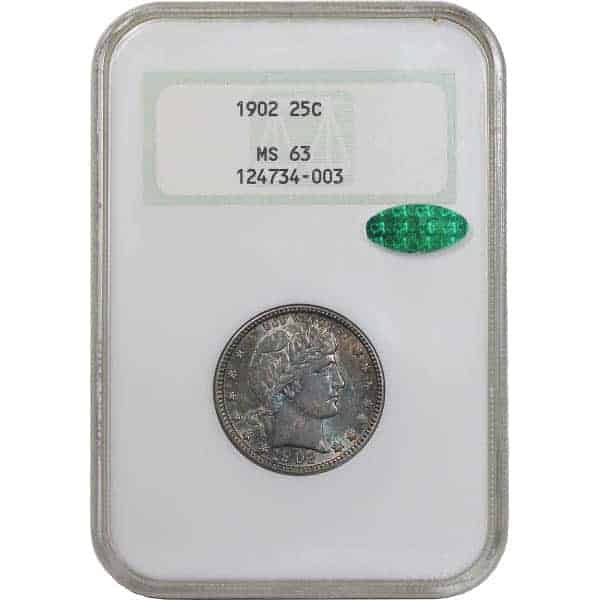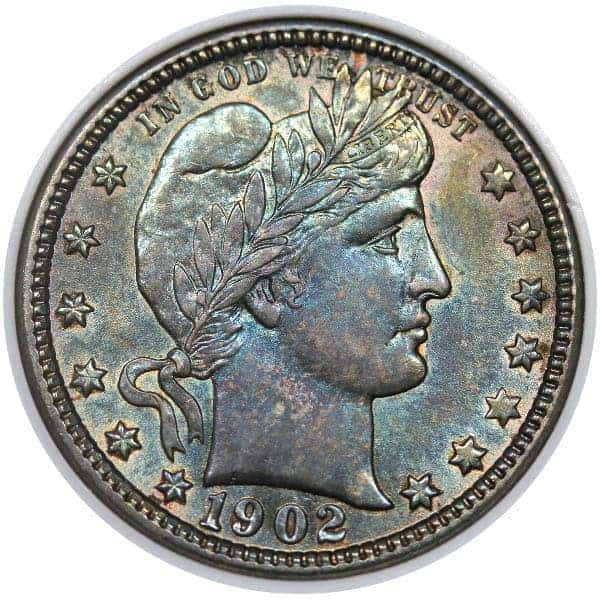 A neat, original example beautifully toned in all-over shades of green, blue, rose and gold and housed in one of the ooooold NGC Fatty slabs with the gold foil label on the back.