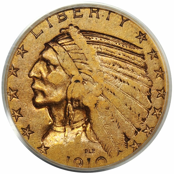 A neat, original, golden orange, well loved $5 Indian in an old PCGS slab.