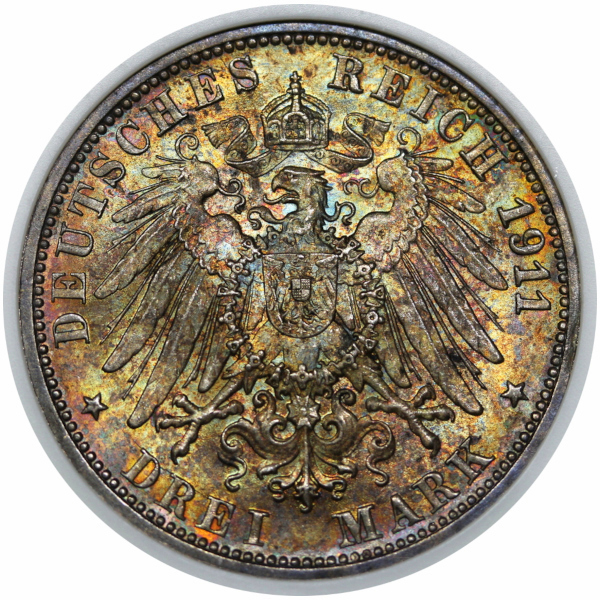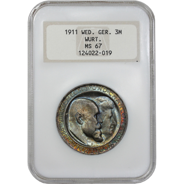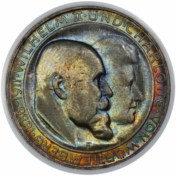 Issued to commemorate Wilhem II and Charlotte’s 25th wedding anniversary, and this is a superb, colorfully toned über gem housed in an old NGC slab.