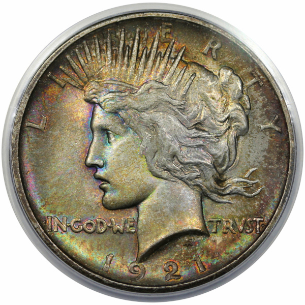 The coolest toned 1921 we’ve owned (or seen, actually), with pink, silvery blue, chartreuse green and golden toning.