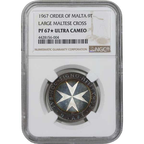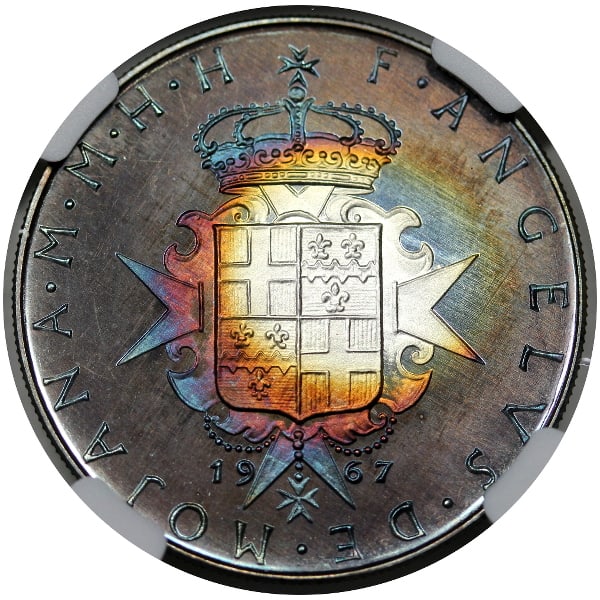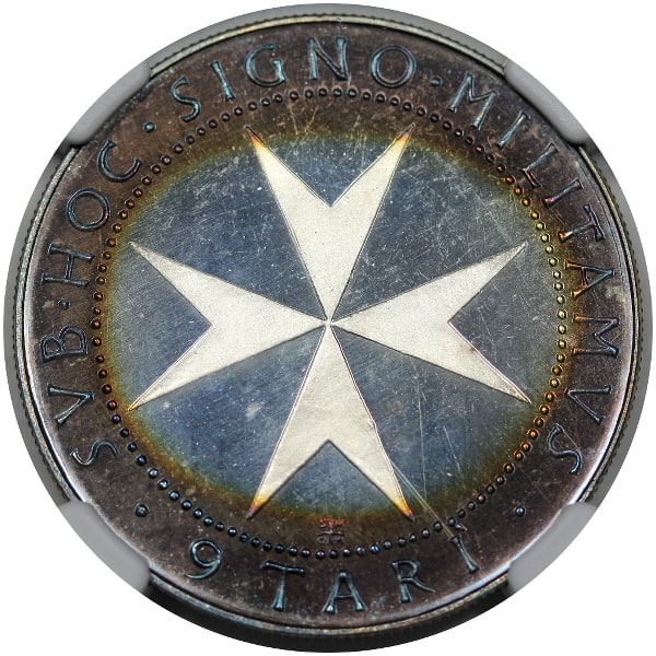 An incredibly striking über-gem with the Large Maltese Cross on the obverse, Crowned Arms on the reverse and fantastic toning throughout.