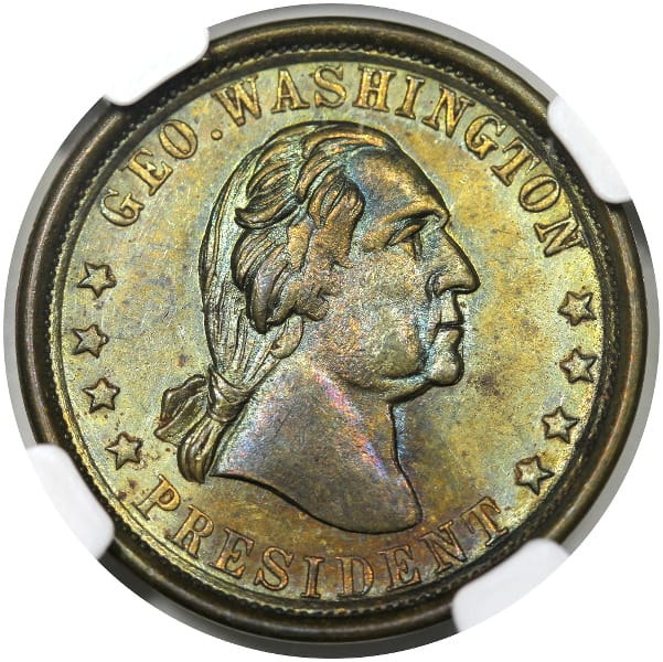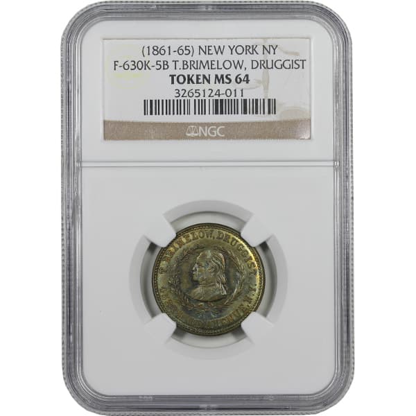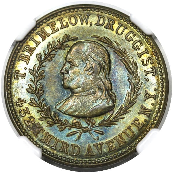 A classic Washington portrait on the obverse mated to the T. Brimelow Druggist-Ben Franklin reverse.